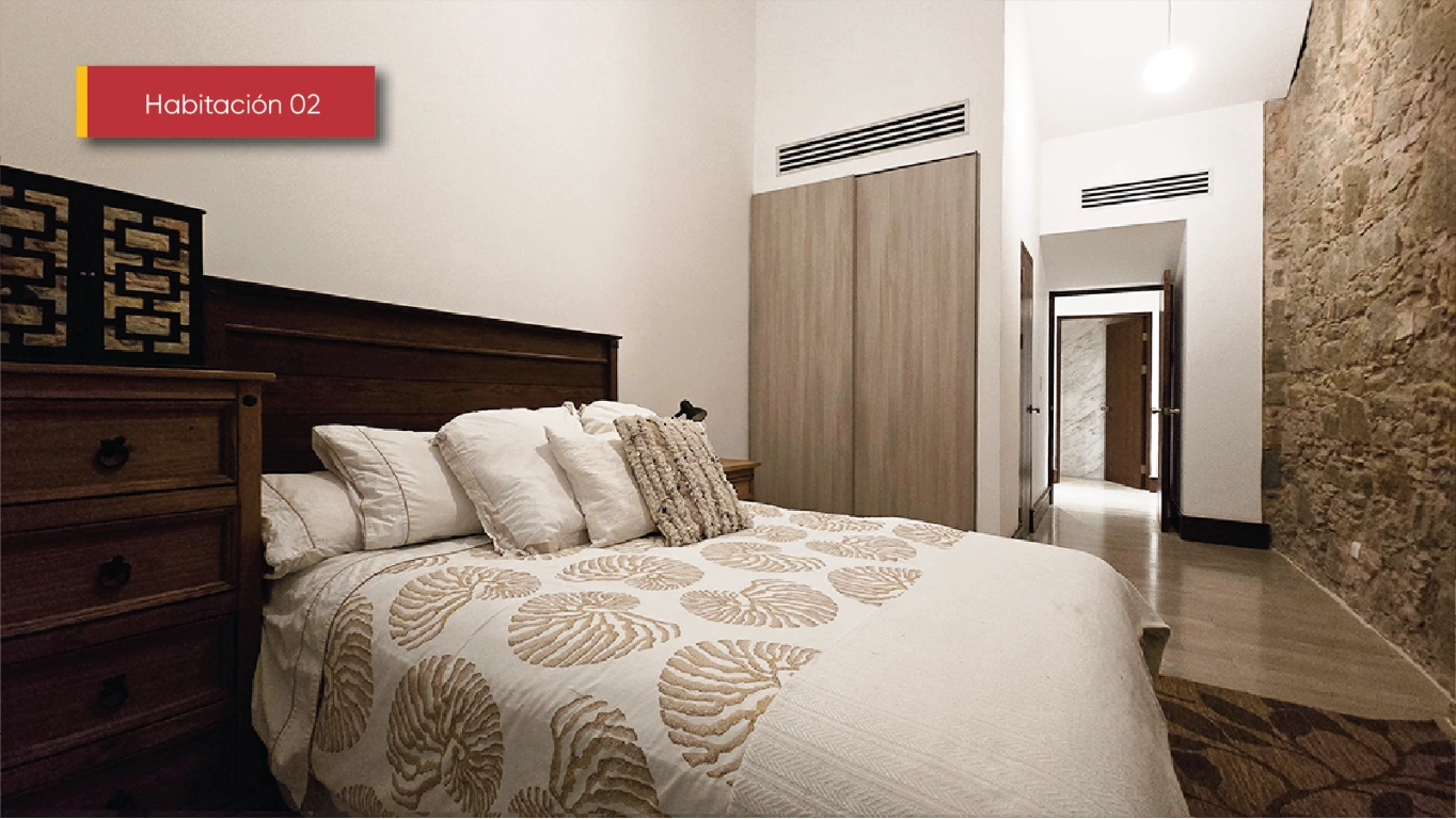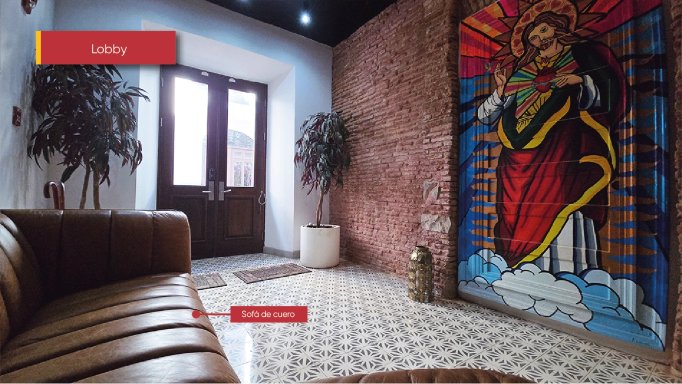 Entrada a lobby con sofá en cuero, arte y detalles coloniales
